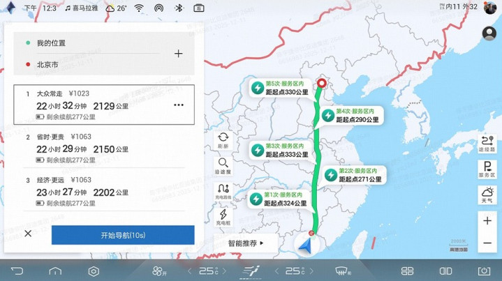 针对用户出行痛点,本次升级在便捷性上实现重要突破。地图新增“充电路线”功能,当系统监测到剩余续航里程可能无法到达目的地时,一键点击【充电路线】按钮,即可自动规划最优充电方案,省去手动添加充电站的繁琐操作。